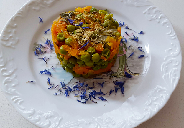 Servir les légumes dans chaque assiette, arroser d’un filet d’huile de cameline puis parsemer de sel Le Christophe Colomb et d’aromates.
