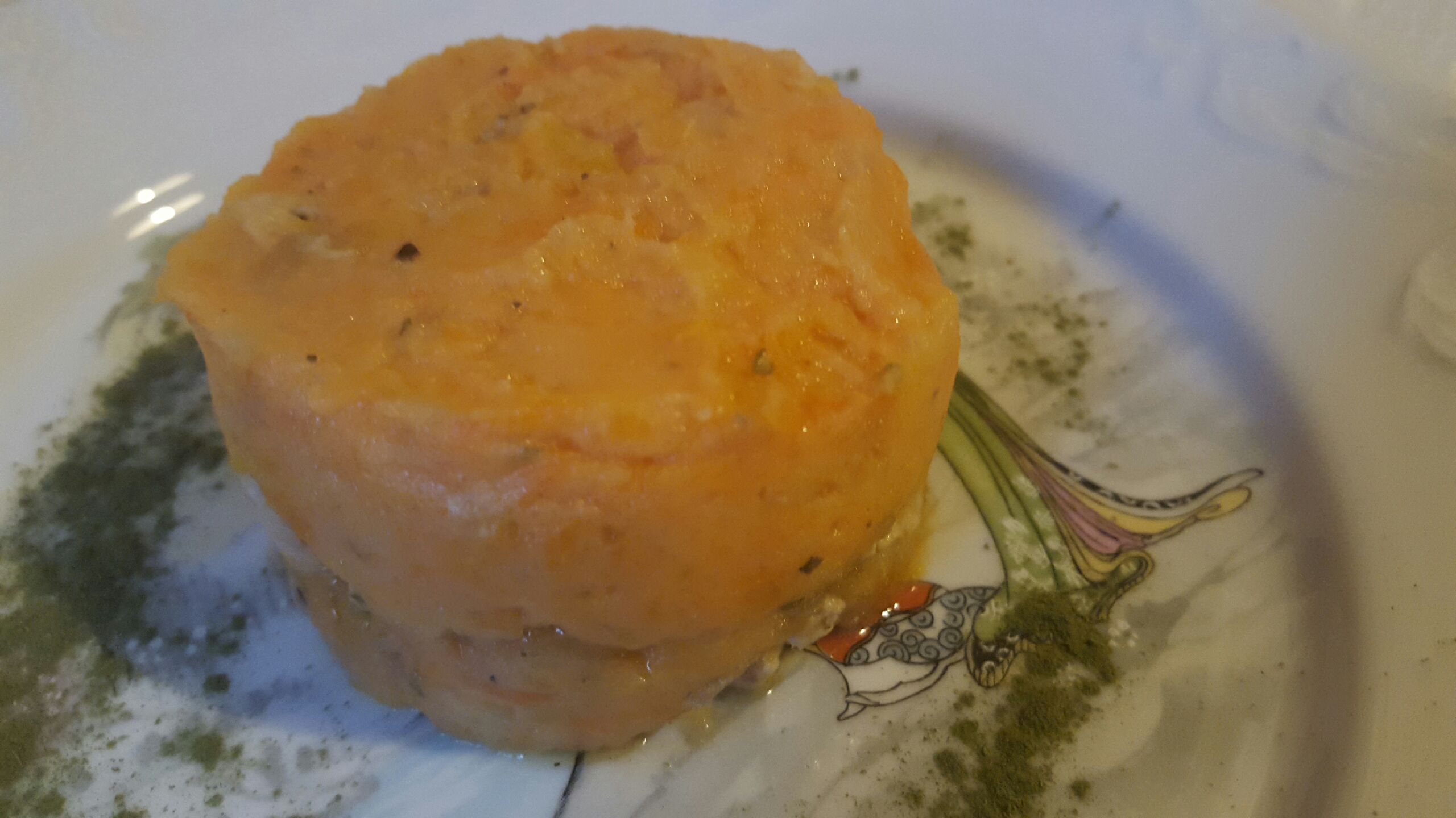 Passer les pommes de terre et le potiron au moulin à légumes en incorporant la crème et le reste d’huile. Salez, poivrer, ajouter la muscade et le concentré Le Cristolien.